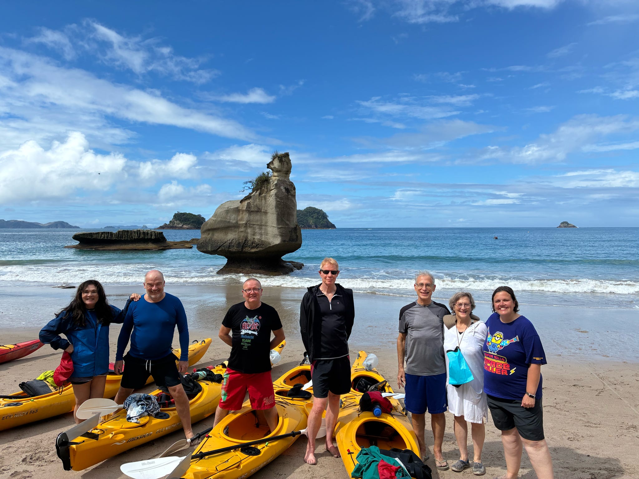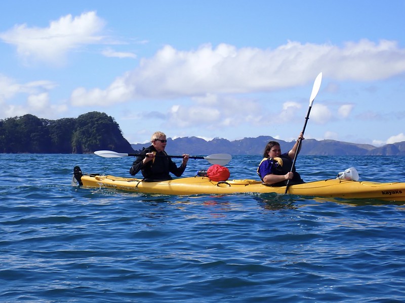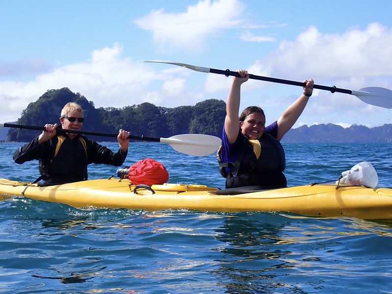 We had a quick stop for lunch, and then headed to Hahei where seven of us decided to sign up for an afternoon of sea-kayaking to Cathedral Cove. I teamed up with Gerard, and we made pretty quick progress with our paddling along the coast (if I do say so myself!).