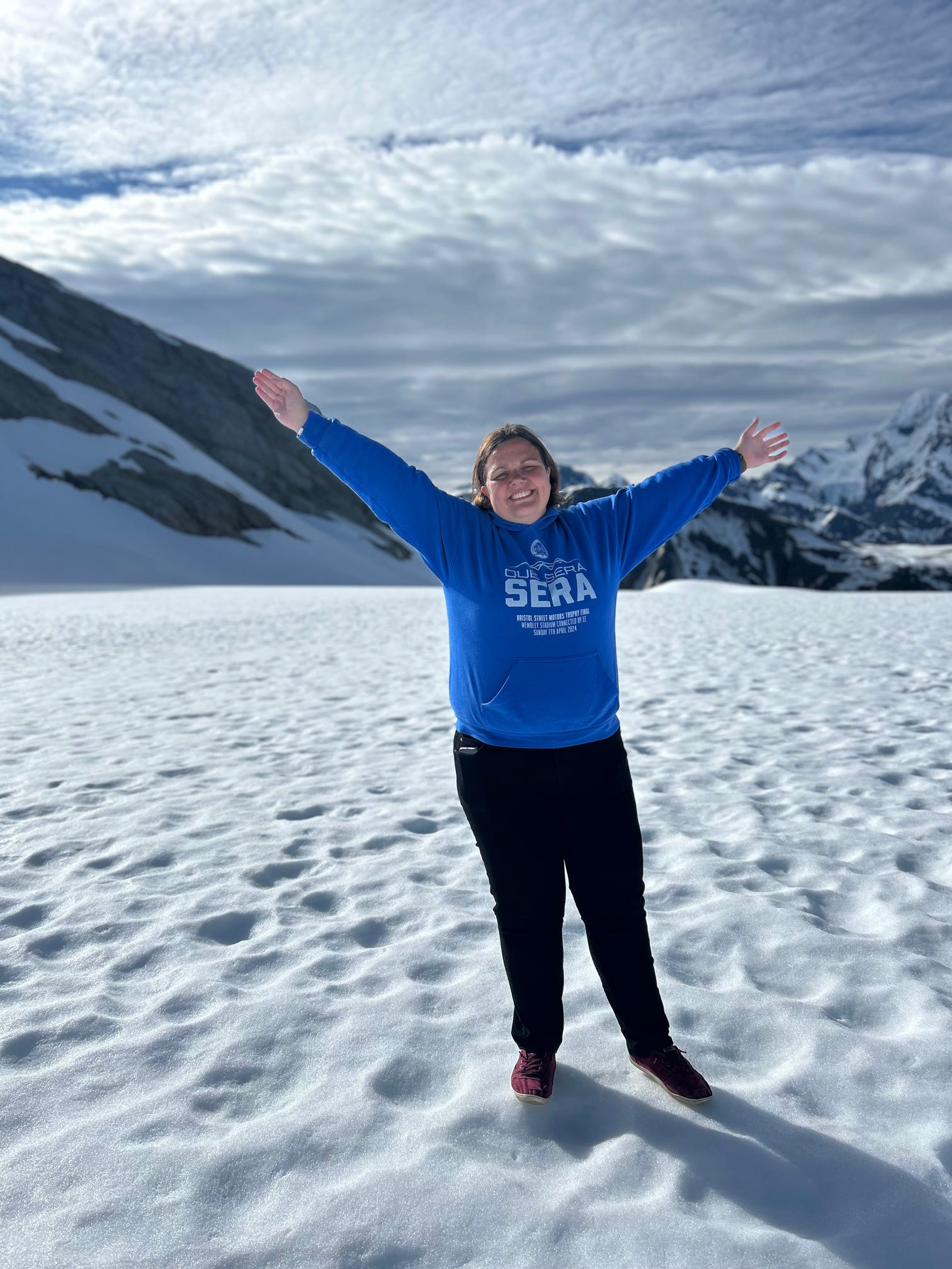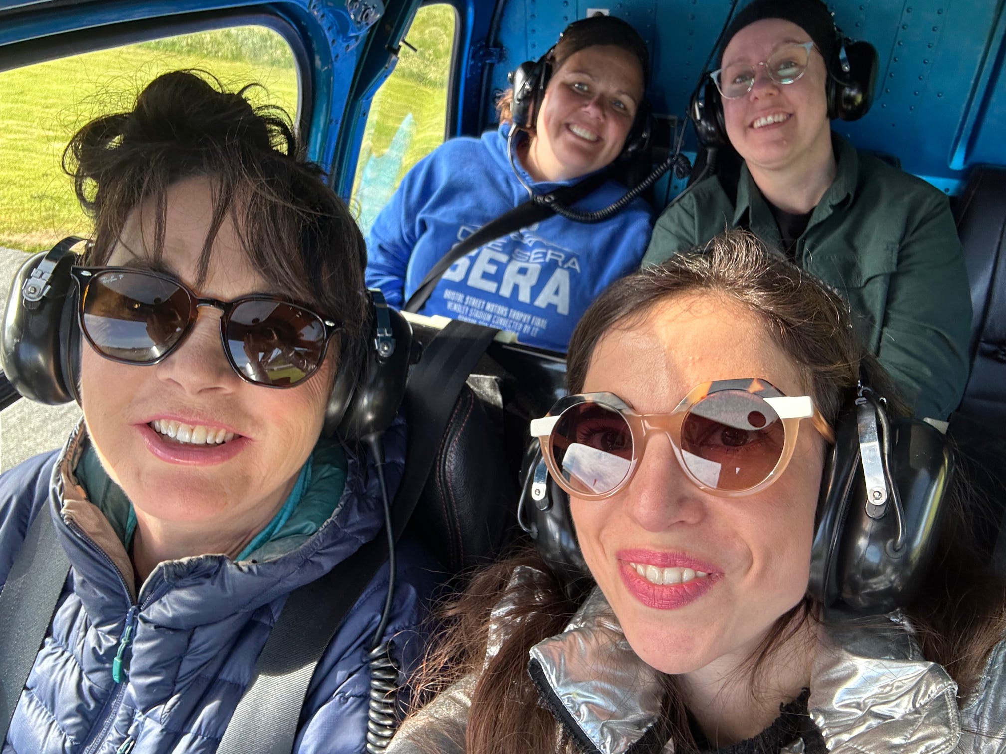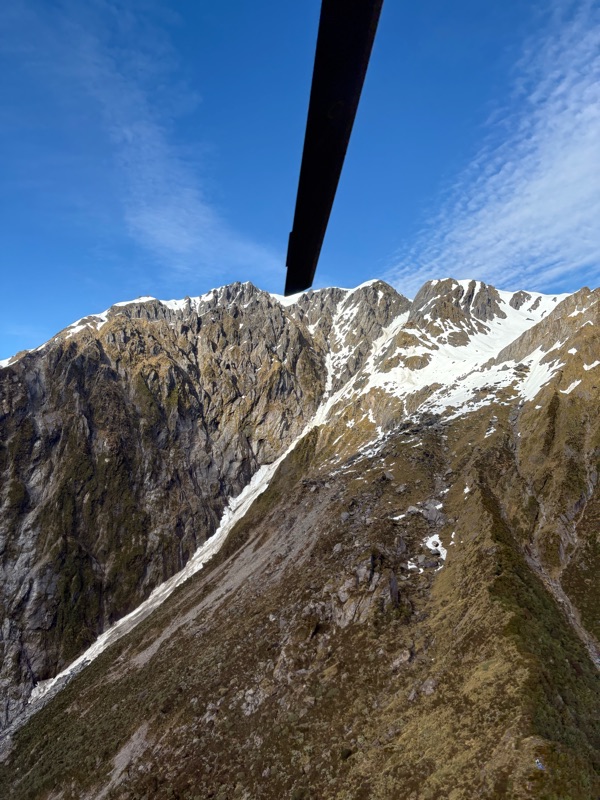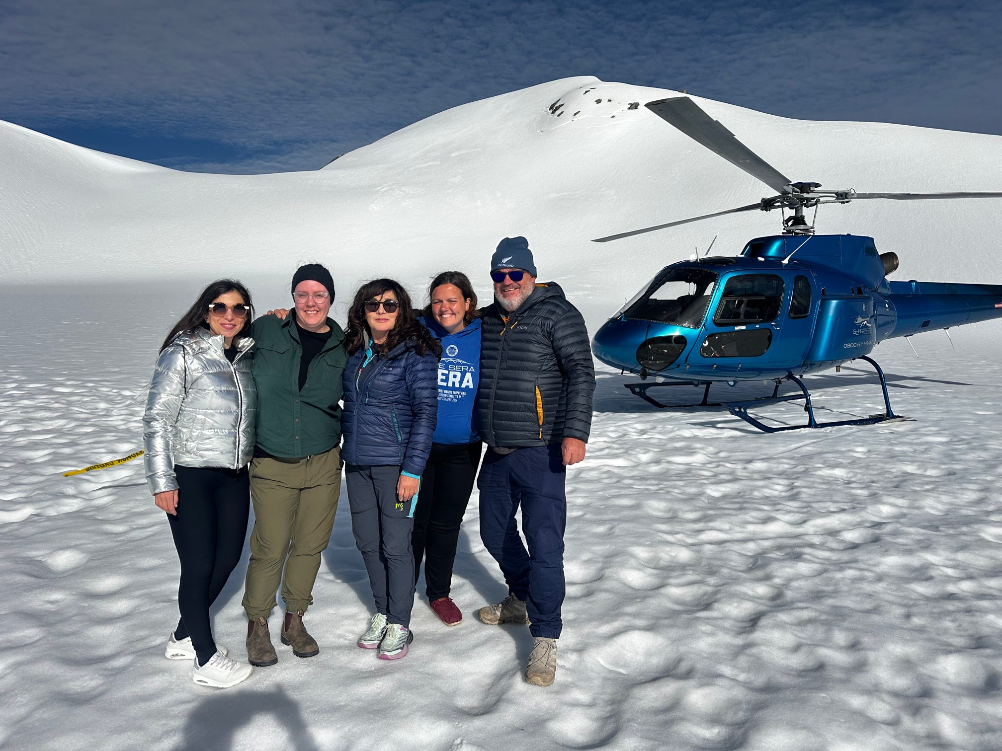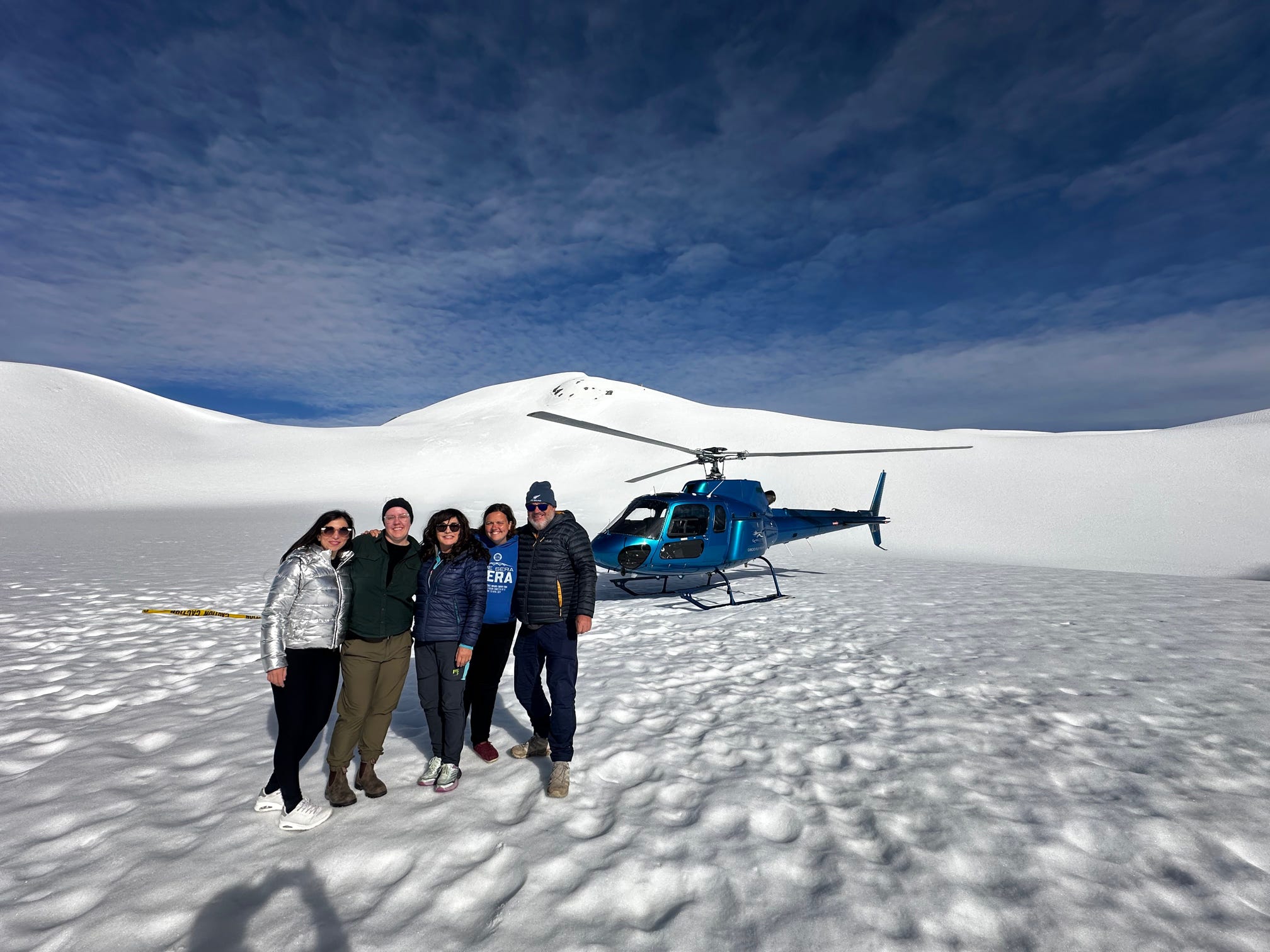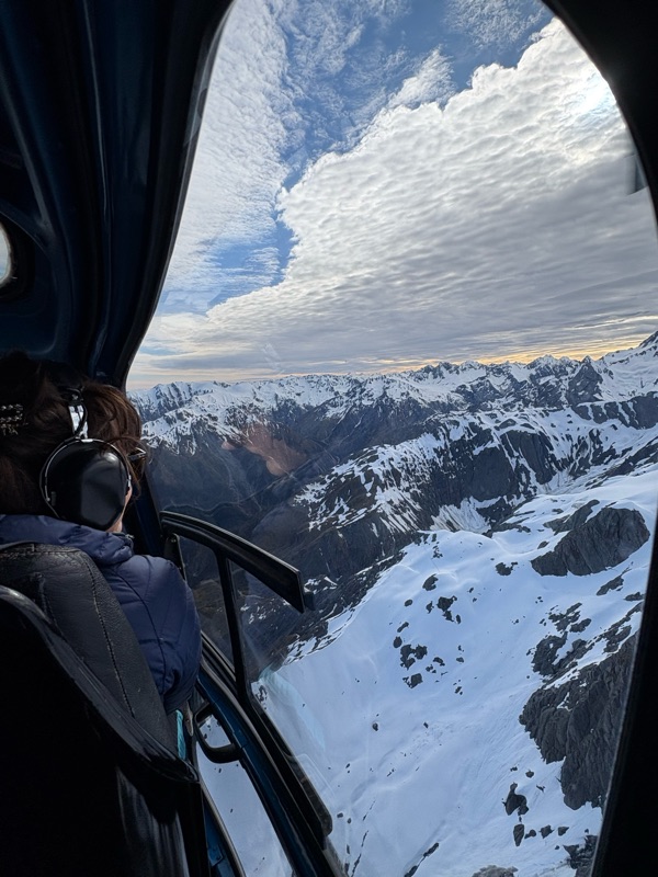 We then had a short minibus ride out to the landing site, and it was wonderful to see four helicopters all come in to land in something close to a formation. Jonathan, Viktoria, Fionnuala, Dana and I were in one helicopter with pilot Aaron, and we were soon soaring in the air with stunning views of the mountains and glacier.