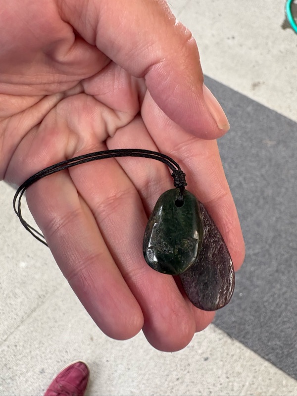 As a group we had found a lot of lovely stones on the beach yesterday, and Jan (who runs the greenstone carving business) was able to tell us which were any good for carving and sanding. Sadly my stones were not the best, but Viktoria had enough aroha stones to sink a battleship, so gave me one, and I also got a small pounamu (greenstone) from Jan. I then spent a very happy couple of hours initially sanding them down and shaping them, and then shining them with diamond-paper. Jan then helped me to fit them together on a necklace to treasure.