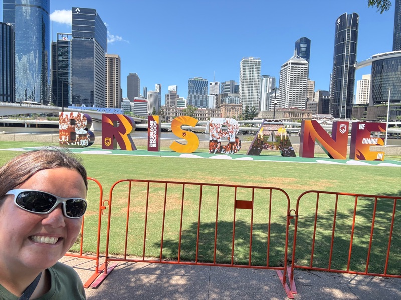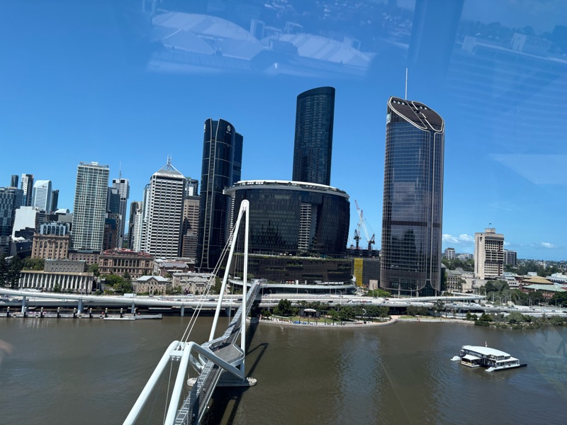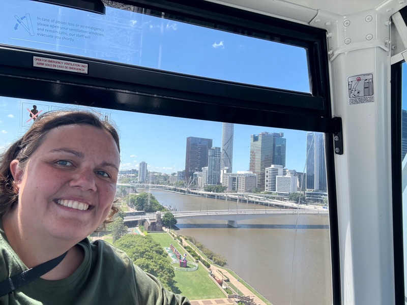 It was then a walk down to the river, across a bridge (with well hidden geocache!) and to the cultural centre. I had a general wander about, took the compulsory photo of the Brisbane Sign, and then went on the Wheel of Brisbane, which was lovely with its air conditioned pods and commentary about the city. My favourite fact that I learnt was that all the streets of Brisbane CBD are named after UK royals, with female streets running one way (kind of East-West, but not quite!) and then male streets perpendicular to them.