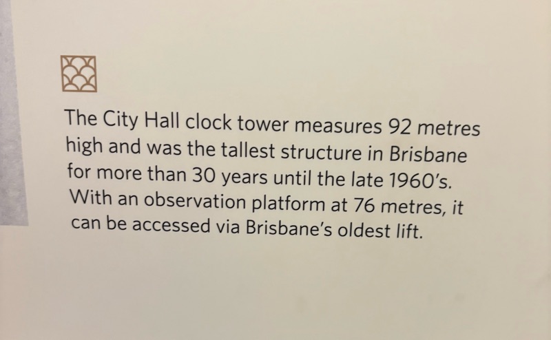 I had a brief look around the Museum of Brisbane, a quick drink and banana bread, and then got on the tour of the Clock Tower. Pleasingly there was a lift up what used to be Brisbane’s tallest building, but very much is not now!