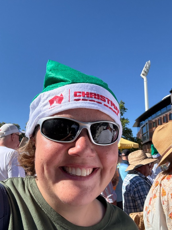 First ball was at 10am, but there was a lot happening even before that - news of Steve Smith not being able to play spreading round, the giving out of Green Santa hats, the important toss (won by Australia), and then the anthems and a very moving rendition of ‘True Blue’ in respect for those affected by the events at Bondi.